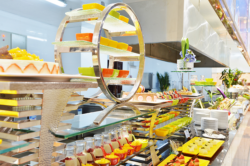 酒店26樓雅典娜自助餐廳集中華烹飪之精華,匯世界食材之大成,既有傳統(tǒng)的東方特色,又有濃郁的異域風(fēng)情,為了滿足自助餐廳的這種特點(diǎn),在設(shè)計(jì)方面主要在冷餐區(qū)和熱食區(qū)這兩大區(qū)域進(jìn)行重點(diǎn)分析設(shè)計(jì),其進(jìn)門處為色拉、刺身、甜品等,再往里就是西餐檔、BBQ、中式面檔,整個(gè)功能區(qū)域劃分清晰,布局考究,廚師在餐廳的明檔區(qū)對(duì)食材進(jìn)行加工制作,就餐者可近距離感受美食的即時(shí)制作,實(shí)時(shí)監(jiān)控做菜過程,吃得更放心!